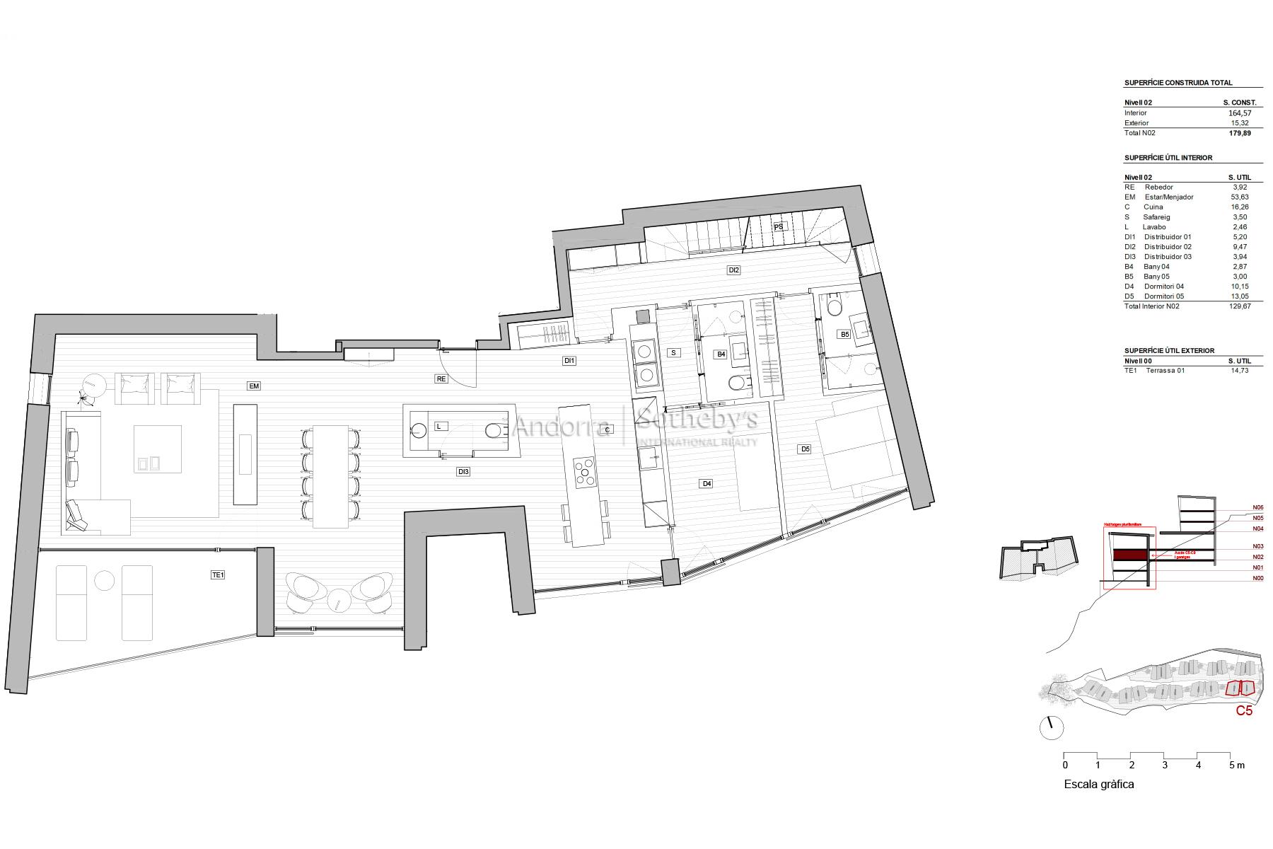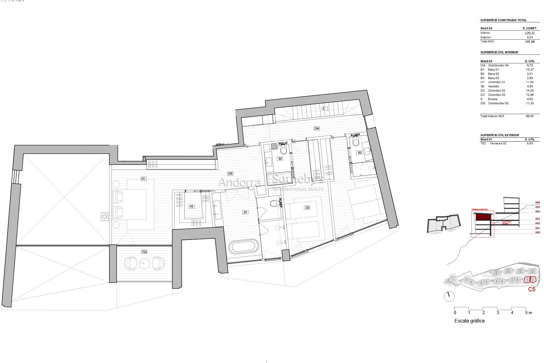 VIVIENDA 5.3 Bienvenido a su nuevo hogar, donde la elegancia se une a la naturaleza en un entorno privilegiado. Situado en Els Vilars, Escaldes, este espectacular dúplex es la opción perfecta para aquellos que buscan un exquisito equilibrio entre tranquilidad y comodidad, a tan solo unos minutos del vibrante centro de la capital andorrana. Con una arquitectura sostenible, esta exclusividad destaca por amplias aberturas que permiten que la luz natural inunde cada rincón, creando una atmósfera de serenidad. Las espectaculares vistas sobre Escaldes y las majestuosas montañas que lo rodean aportan un valor añadido, mientras que su orientación sur garantiza una iluminación excelente durante todo el día, desde el amanecer hasta el atardecer. Este inmueble plurifamiliar ocupa la segunda planta y el ático del edificio más emblemático de la promoción. Cuenta con 5 dormitorios en suite, un baño de invitados y dos terrazas que invitan a disfrutar del exterior. La planta baja del dúplex ofrece una sala de estar de generosas dimensiones con doble altura, equipada con una chimenea singular que separa el área del comedor, creando ambientes distintivos en un solo espacio. La cocina, de gran formato con isla central, se complementa con un dormitorio de servicio con lavadero y un dormitorio en suite. En el ático, encontramos tres dormitorios en suite, entre los cuales destaca el dormitorio principal, que impresiona por sus dimensiones, acceso directo a la terraza y las vistas más espectaculares de Escaldes. Con orientaciones sur, este y oeste, esta propiedad no solo destaca por su belleza exterior, sino también por un diseño pensado para el ahorro energético. El conjunto se complementa con jardines y zonas verdes, ofreciendo un espacio de vida íntimo y placentero. Descubra la verdadera esencia de la vida andorrana en este dúplex único, donde cada detalle ha sido cuidadosamente seleccionado para ofrecerle el máximo confort y una vida llena de armonía y belleza. Bienvenidos a casa.Características