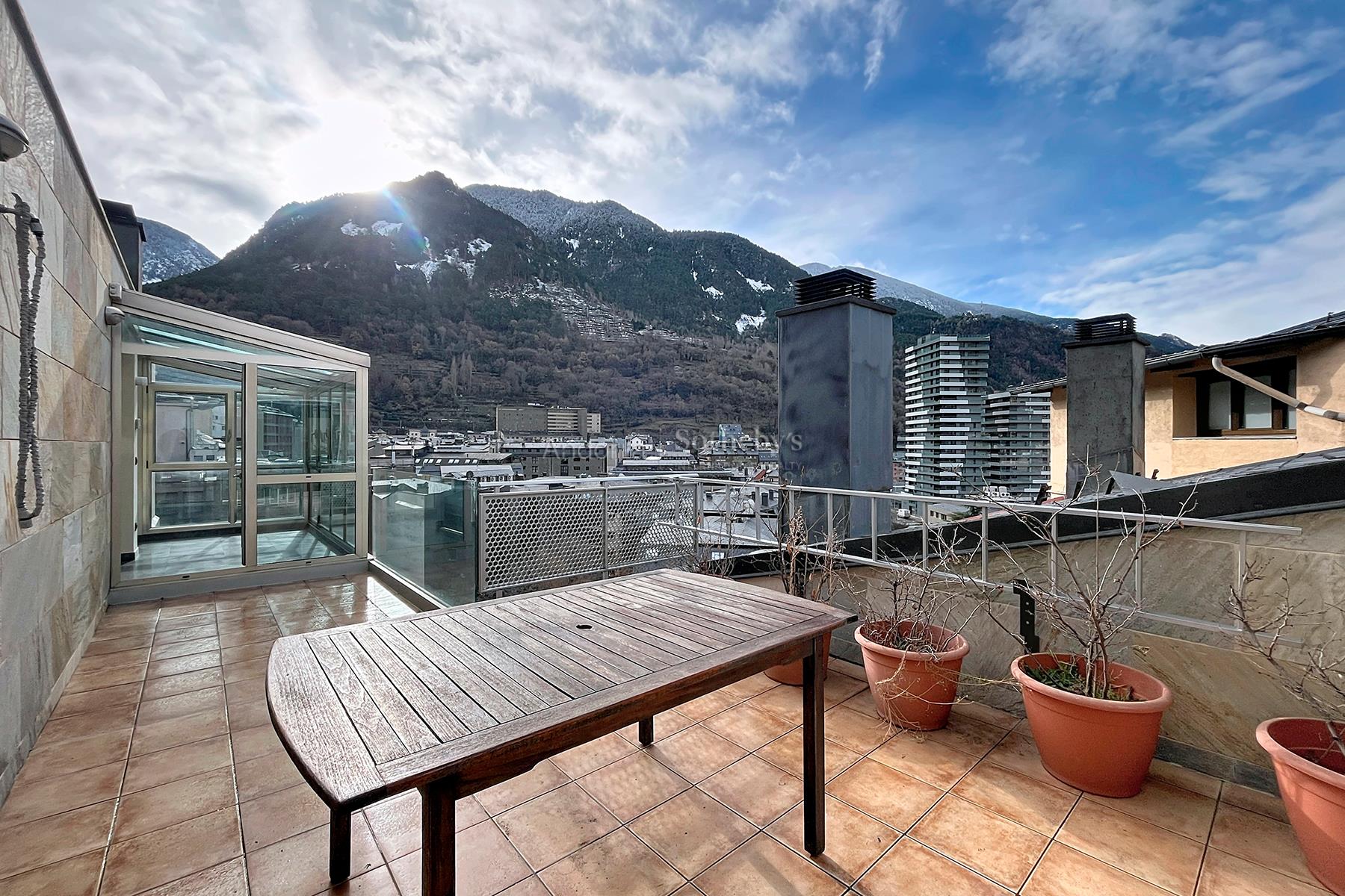 Se presenta este ático singular de 215,05 m², ubicado en pleno centro de Escaldes-Engordany, que ocupa la totalidad de la planta, ofreciendo un nivel excepcional de privacidad, amplitud y luminosidad. Gracias a sus cuatro orientaciones, con clara predominancia sur, la propiedad disfruta de una extraordinaria entrada de luz natural durante todo el día. La zona de noche se distribuye en cuatro elegantes dormitorios, tres de ellos en suite con baño completo, concebidos para garantizar el máximo confort. El cuarto dormitorio dispone de acceso inmediato a un baño completo independiente. Adicionalmente, la vivienda cuenta con un lavabo de cortesía. La zona de día se articula en torno a un sofisticado salón-comedor semiabierto, conectado a la cocina mediante una puerta corredera acristalada de diseño, que permite integrar ambos espacios o independizarlos, configurando una cocina tipo office de alta funcionalidad y estética contemporánea. La propiedad dispone de dos exclusivas terrazas privadas: una de 21,21 m² vinculada a la zona de salón-comedor y cocina, y una impresionante terraza frontal de 39 m² con orientación sur, ideal para disfrutar de momentos al aire libre con total privacidad. Entre sus características más distinguidas destaca el acceso directo mediante ascensor privado al interior de la vivienda, tanto desde el vestíbulo principal como desde el aparcamiento, mediante sistema de acceso con chip, aportando un elevado nivel de seguridad, discreción y confort. La propiedad se completa con dos amplias plazas de aparcamiento, incluidas. Una residencia única y exclusiva, que combina ubicación prime, diseño, privacidad y prestaciones de alto nivel, pensada para quienes buscan una vivienda de representación en una de las zonas más prestigiosas de Andorra.Características