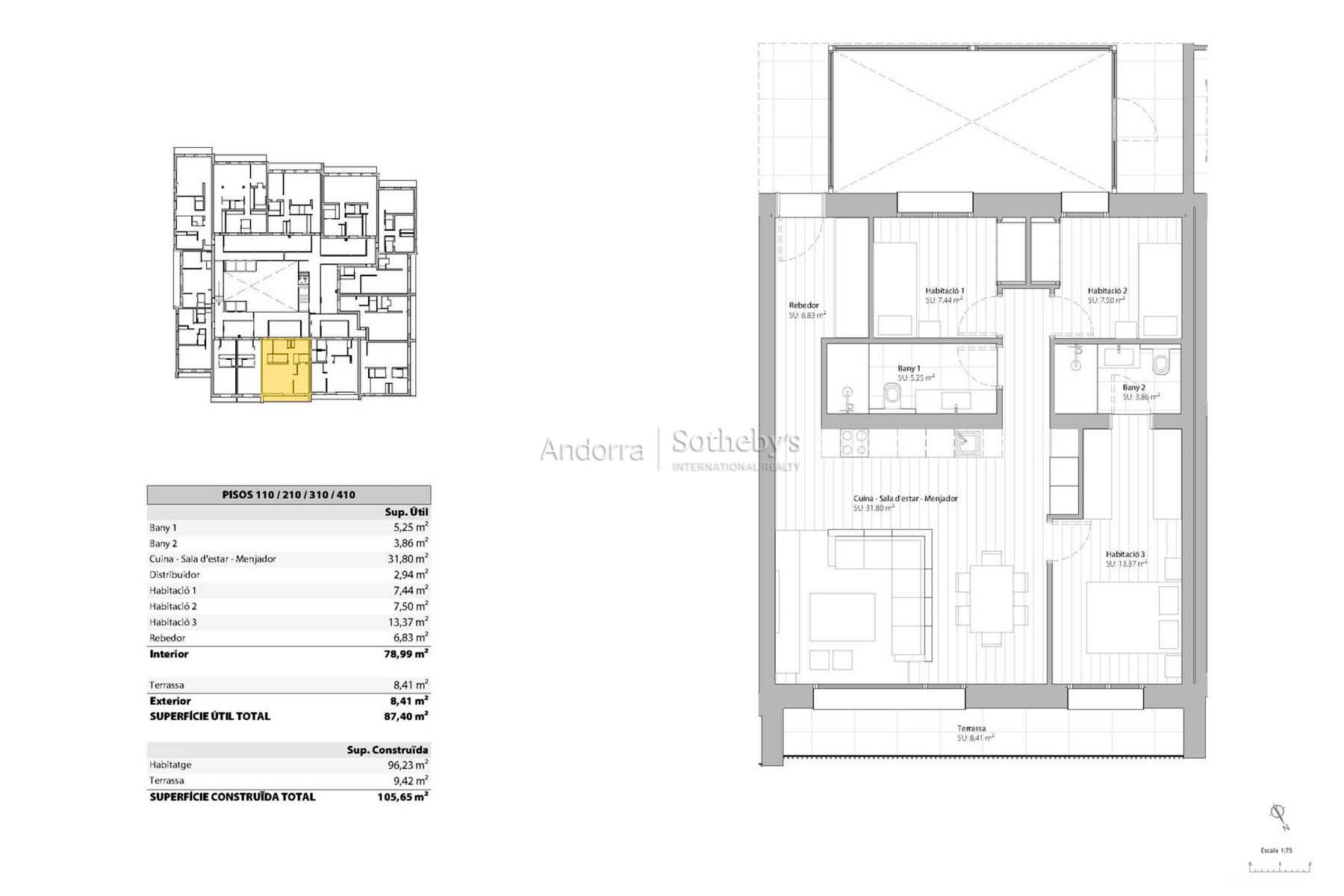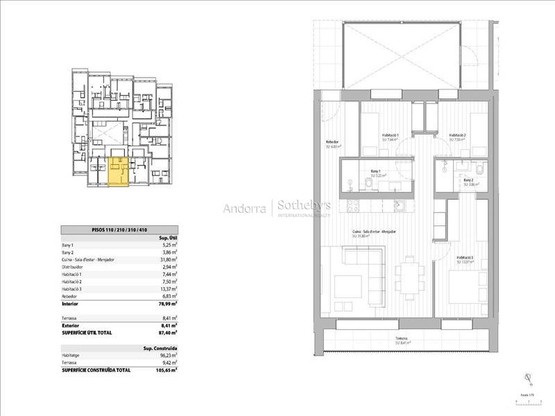 Descubre esta magnífica obra nueva ubicada en El Tarter. Con una superficie de 105,64m2, esta propiedad ofrece un espacio moderno y espacioso para disfrutarlo al máximo. La cocina, integrada en el salón comedor, crea un ambiente acogedor y funcional. Desde aquí podrás acceder a una encantadora terraza de 9,42m2 con vistas. Con tres habitaciones, una suite impresionante con vestidor, dos habitaciones individuales, y dos baños completos, este hogar es perfecto para aquellos que buscan comodidad y estilo. El edificio cuenta con un box privado para dos coches, lo que brinda una comodidad adicional y permite tener tus vehículos protegidos del frío y la nieve. Esta propiedad está equipada con características de alta calidad, como iluminación LED de bajo consumo, suelo radiante y una elegante chimenea eléctrica. Además, cuenta con domótica que te permite controlar y gestionar fácilmente los sistemas del hogar desde su teléfono inteligente. Los electrodomésticos de primera calidad le ofrecen una experiencia culinaria excepcional, mientras que los suelos radiantes, y de gres porcelánico añaden un toque cálido, de sofisticación y durabilidad. La comunidad dispone de un spa y una zona de relax comunitario, donde podrás disfrutar de piscinas y jacuzzis, creando un ambiente de bienestar y relajación. Además un patio central con zona verde completa este entorno, proporcionando un espacio tranquilo y natural. No pierdas la oportunidad de vivir en esta maravillosa propiedad en El Tarter. Características