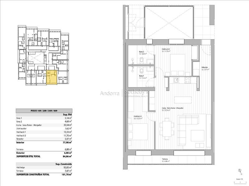 Descubre esta magnífica obra nueva ubicada en El Tarter. Con una superficie de 101,81m2, esta propiedad ofrece un espacio moderno y espacioso para disfrutarlo al máximo. La cocina, integrada en el salón comedor, crea un ambiente acogedor y funcional. Desde aquí podrás acceder a una encantadora terraza de 7,87m2 con vistas. Con dos amplias habitaciones dobles, incluyendo una suite impresionante, y dos baños completos, este hogar es perfecto para aquellos que buscan comodidad y estilo. El edificio cuenta con un box privado para dos coches, lo que brinda una comodidad adicional y permite tener tus vehículos protegidos del frío y la nieve. Esta propiedad está equipada con características de alta calidad, como iluminación LED de bajo consumo, suelo radiante y una elegante chimenea eléctrica. Además, cuenta con domótica que te permite controlar y gestionar fácilmente los sistemas del hogar desde su teléfono inteligente. Los electrodomésticos de primera calidad le ofrecen una experiencia culinaria excepcional, mientras que los suelos radiantes, y de gres porcelánico añaden un toque cálido, de sofisticación y durabilidad. La comunidad dispone de un spa y una zona de relax comunitario, donde podrás disfrutar de piscinas y jacuzzis, creando un ambiente de bienestar y relajación. Además un patio central con zona verde completa este entorno, proporcionando un espacio tranquilo y natural. No pierdas la oportunidad de vivir en esta maravillosa propiedad en El Tarter.Características