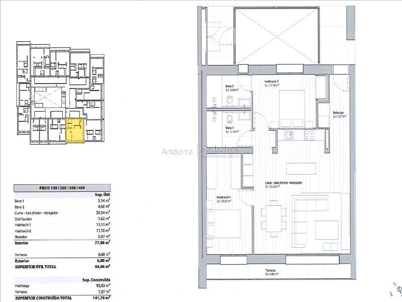 Descobreix aquesta magnífica obra nova ubicada a El Tarter. Amb una superfície de 101,81m2, aquesta propietat ofereix un espai modern i espaiós per gaudir-ne al màxim. La cuina, integrada al saló menjador, crea un ambient acollidor i funcional. Des d'aquí podràs accedir a una encantadora terrassa de 7,87 m2 amb vistes. Amb dues àmplies habitacions dobles, incloent una suite impressionant, i dos banys complets, aquesta llar és perfecta per a aquells que busquen comoditat i estil. L'edifici compta amb un box privat per a dos cotxes, cosa que brinda una comoditat addicional i et permet tenir els teus vehicles protegits del fred i la neu. Aquesta propietat està equipada amb característiques d'alta qualitat, com il·luminació LED de baix consum, terra radiant i una elegant xemeneia elèctrica. A més, compta amb domòtica que et permet controlar i gestionar fàcilment els sistemes de la llar des del telèfon intel·ligent. Els electrodomèstics de primera qualitat us ofereixen una experiència culinària excepcional, mentre que els sòls radiants, i de gres porcellànic afegeixen un toc càl.lid, de sofisticació i durabilitat. La comunitat disposa d´un spa i una zona de relax comunitari, on podràs gaudir de piscines i jacuzzis, creant un ambient de benestar i relaxació. A més, un pati central amb zona verda completa aquest entorn, proporcionant un espai tranquil i natural. No perdis l'oportunitat de viure en aquesta meravellosa propietat a El Tarter.Característiques