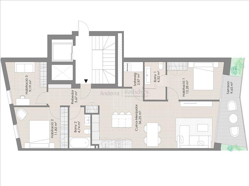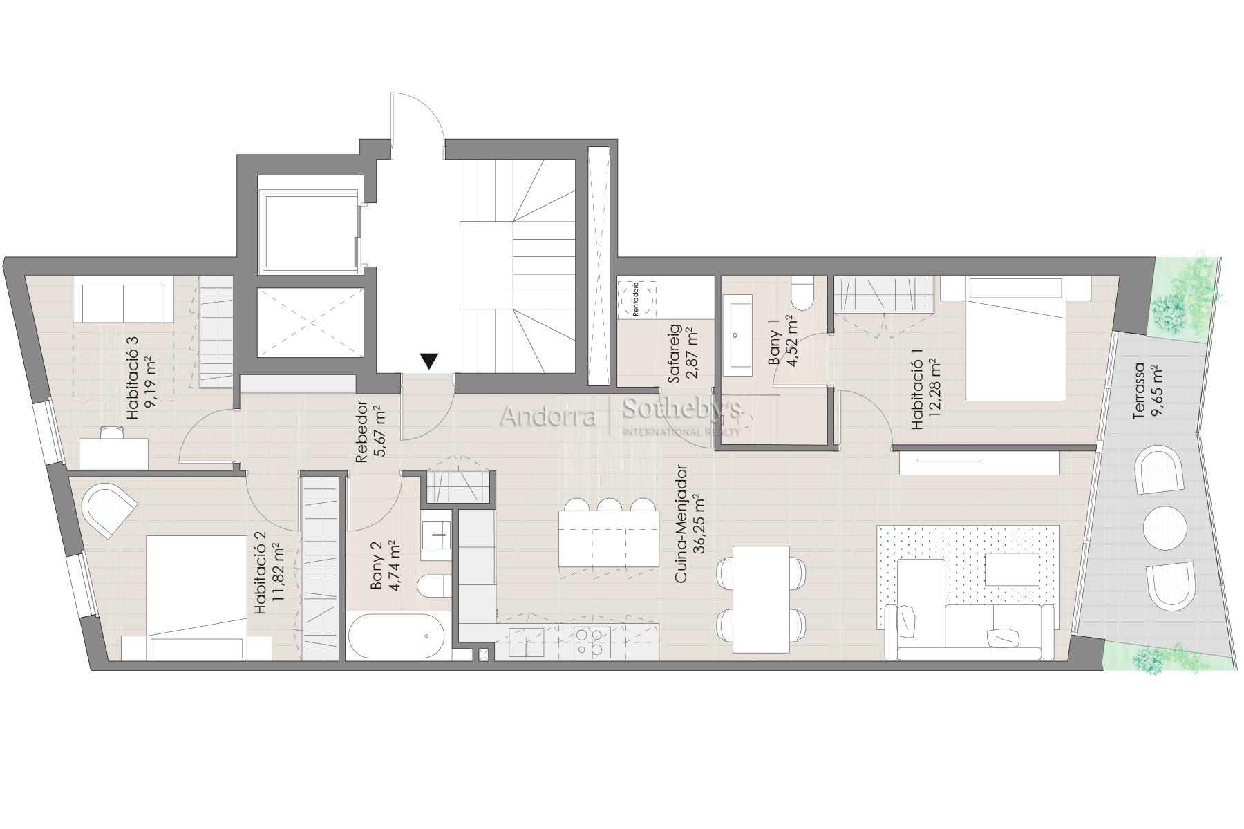 Aquest magnífic pis d’obra nova, en construcció, es troba a tocar de la principal avinguda comercial de la Massana, en una zona residencial familiar prop de la piscina comunal i les pistes de tennis, molt tranquil·la i perfectament comunicada. Té a disposició tots els serveis necessaris i es troba a només 400 metres del telecabina que permet accedir a les pistes d’esquí del domini de Pal-Arinsal. El pis té 110m² distribuïts en un gran saló menjador amb accés a una terrassa de 9m², una àmplia cuina, integrada al menjador, equipada amb electrodomèstics de gama alta, amb sala de bugaderia independent. A la zona de descans hi ha 3 habitacions, una d’elles en suite amb bany complet, una doble, i l´altra individual, i totes tres amb armaris encastats. També hi ha un segon bany complet. La propietat disposa d´una plaça d’aparcament al mateix edifici. Orientat a est, el pis gaudeix del sol des de les primeres hores de dia fins a mitja tarda, i té vistes al Camí Ral, amb el riu i a la vall de la Massana. Aquest exclusiu apartament, perfectament situat, és una excel·lent inversió per una família que busqui una residencia de prestigi al centre d’una ciutat amb el dinamisme de La Massana i vol gaudir de la seva gran oferta d’activitats amb tot l’espai i les comoditats necessàries.Característiques