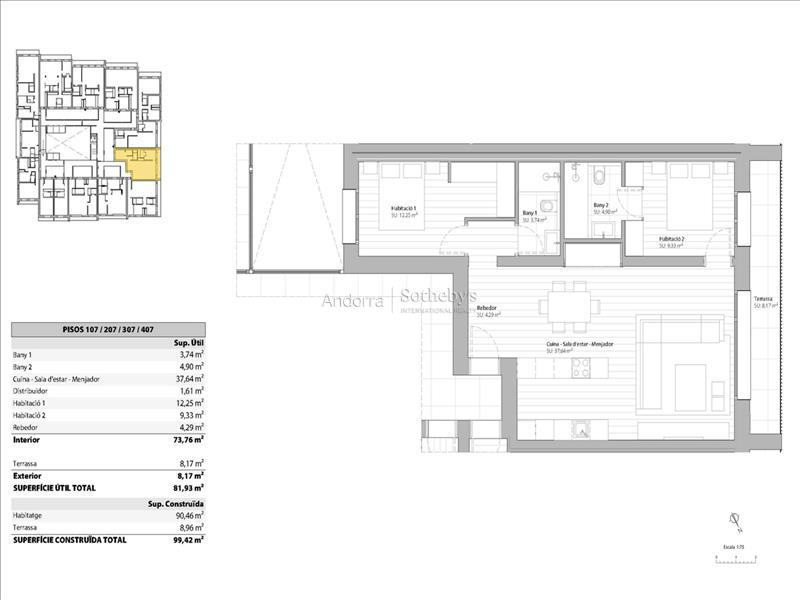 Descobreix aquesta magnífica obra nova ubicada a El Tarter. Amb una superfície de 99,40 m2, aquesta propietat ofereix un espai modern i espaiós per gaudir-ne al màxim. Amb dues àmplies habitacions dobles, incloent una suite impressionant, aquesta llar és perfecta per a aquells que busquen comoditat i estil. La cuina, integrada al saló menjador, crea un ambient acollidor i funcional. Des d'aquí podràs accedir a una encantadora terrassa de 8,95 m2 amb vista panoràmica a la Vall de Canillo, i sol de tarda. Imagina gaudir dels àpats exteriors o relaxar-te mentre contemples les impressionants vistes, i les postes de sol. L'edifici compta amb un box privat per a dos cotxes, cosa que brinda una comoditat addicional i et permet tenir els teus vehicles protegits del fred i la neu. Aquesta propietat està equipada amb característiques d'alta qualitat, com il·luminació LED de baix consum, terra radiant i una elegant xemeneia elèctrica. A més, compta amb domòtica que et permet controlar i gestionar fàcilment els sistemes de la llar des del telèfon intel·ligent. Els electrodomèstics de primera qualitat us ofereixen una experiència culinària excepcional, mentre que els sòls radiants, i de gres porcellànic afegeixen un toc càl.lid, de sofisticació i durabilitat. La comunitat disposa d´un spa i una zona de relax comunitari, on podràs gaudir de piscines i jacuzzis, creant un ambient de benestar i relaxació. A més, un pati central amb zona verda completa aquest entorn, proporcionant un espai tranquil i natural. No perdis l'oportunitat de viure en aquesta meravellosa propietat a El Tarter.Característiques